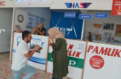 Zonguldak'ın Alaplı ilçesi Şehirlerarası Otobüs Terminali'nde biletinde sorun olduğu için otobüsten inen bayan öğretmen, sorunu çözmek için gittiği bilet gişesinde sürpriz evlenme teklifi aldı.