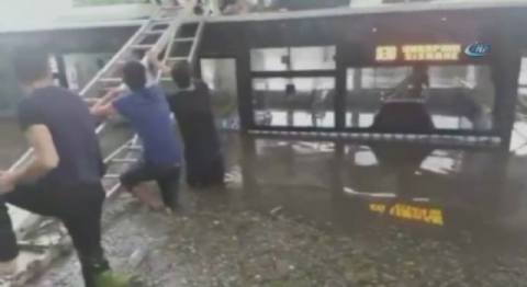 İstanbul Aksaray'da şiddetli yağışın ardından otobüslerin üzerinde mahsur kalan vatandaşlar merdivenlerle kurtarıldı. İstanbul Aksaray'da etkili olan yağışın ardından yollar göle döndü. Göle dönen yollarda bazı otobüsler sulara gömülerken vatandaşlar da korunmak için otobüslerin üzerine çıktı. Otobüslerin üzerinde bekleyen vatandaşlar yine çevredeki vatandaşlar tarafından merdiven uzatılarak mahsur kaldıkları yerden kurtarıldı.