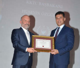 KKTC Başbakanı Hüseyin Özgürgün'e Yakın Doğu Üniversitesi Kurucu Rektörü Dr. Suat İ. Günsel tarafından 'Yakın Doğu Altın Anahtar Onur Ödülü ve Onur Belgesi' takdim edildi.