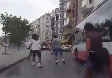 Yaz mevsiminin gelmesiyle, özelikle gençler giydikleri patenle İzmir sokaklarında geziyor. Gençler kimi zaman da her şeyden habersiz ölüme adeta meydan okuyor. Konak ilçesi Eşrefpaşa'da çekilen görüntülerde yürekleri ağza getirdi. Ayaklarındaki patenle yolcu otobüsün arkasına tutunan 7 genç, seyir halinde ilerleyen otobüsle yolculuk yaptı. Her şeyden habersiz ölümle burun burun gelen çocuklar ise güle-oynaya bu anın tadını çıkardı. Görüntüler ise yolcu otobüsünün hemen arkasında seyir halinde ilerleyen bir vatandaş tarafından kaydedildi. Gençler, daha sonrada duran otobüsün arkasından hep beraber yola çıkarak patenlerle yoluna devam etti. İzmir'in bir başka semtinden paylaşılan farklı bir görüntü de yine çocukların otobüsün arkasına tutunduğu görüldü.