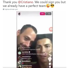 Real Madrid'in dünyaca ünlü yıldızı Cristiano Ronaldo, Instagram hesabından canlı yayın yaptı. Portekizli yıldız yaklaşık 250 bin kişinin izlediği canlı yayında Göztepe file bekçisi Beto ile birlikte "Göz Göz Göztepe" tezahüratını yaptı.