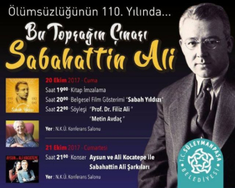 Tekirdağ'ın Süleymanpaşa Belediyesi, 41 yıllık yaşantısına sayısız önemli eser bırakan Sabahattin Ali'yi, çeşitli etkinliklerle anacak. "Bu Toprağın Çınarı Sabahattin Ali" adı altında Sabahattin Ali, 110. ölüm yıl dönümü dolayısıyla Tekirdağ'da anılacak. "Bu Toprağın Çınarı Sabahattin Ali" programı kapsamında etkinlik, 20 Ekim Cuma günü Namık Kemal Üniversitesi Rektörlük Konferans Salonu'nda saat 19.00'da kitap imzalama programı ile başlayacak. Saatler 20.00'yi gösterdiğinde Metin Avdaç'ın yönetmenliğini yaptığı Sabahattin Ali'nin hayatının anlatıldığı "Sabah Yıldızı" belgesel filminin gösterimi yapılacak. Belgesel film gösteriminin ardından saat 22.00'de Prof. Dr. Filiz Ali ve Metin Avdaç ile Sabahattin Ali konulu söyleşi gerçekleştirilecek. Etkinlik kapsamında 21 Ekim Cumartesi de Namık Kemal Üniversitesi Rektörlük Konferans Salonu'nda saat 21.00'de Ali Kocatepe ile Sabahattin Ali şarkıları konseri düzenlenecek.