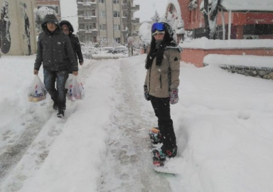 Sokak aralarında karın tadını doyasıya çıkaran gençlerin arasında snowboard yapan 19 yaşındaki Sevda Malkoç ise dikkat çekti. Uludağ'ın zirvesinde kayıyormuş gibi karın keyfini çıkaran Malkoç, "Uludağ'a çıkmayınca, şiddetli yağan karda kayarak, arkadaşlarla tadını çıkarıyoruz" dedi.