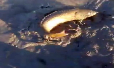 Eskişehir'de sel sularının tarlalardan çekilmesiyle toprak üzerinde kalan bir balığı çiftçinin yakalaması cep telefonu kamerasına yansıdı.
