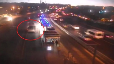E-5 Karayolu Küçükçekmece mevkiinde ilerleyen servis minibüsünün kontrolden çıkarak metrobüs durağına çarptığı kaza, kameralar tarafından saniye saniye kaydedildi. Kaza, sabah saatlerinde Küçükçekmece E5 Karayolunda meydana gelmiş, , E5 karayolundan Edirne istikametine giden servis minibüsü, sürücünün direksiyon hakimiyetini kaybetmesi sonucu yoldan çıkarak metrobüs durağına girmişti. Sabah saatlerinde olmasından dolayı facianın eşiğinden dönülen kaza güvenlik kameraları tarafından saniye saniye kaydedildi. Görüntülerde servis minibüsü bir anda yoldan çıkıyor. Bariyeri aşan minibüs ardından hızla metrobüs durağına giriyor. (Mehmet Başa /İHA)