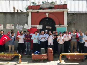 Büyük Osmanlı Derneği üyesi bir grup, İsrail'in Mescid-i Aksa'ya yönelik ablukasını protesto etti. Eyüp Ayvansaray'da bulunan Ahrida Sinagogu önünde toplanan grup, ellerinde pankartlarla İsrail aleyhine çeşitli sloganlar attı. Grup daha sonra sinagogun kapısına temsili olarak x-ray cihazı koyarak basın açıklaması yaptı.