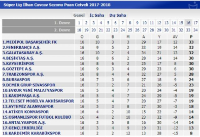 Avrupa maçları ve ligi bir arada götürmekte zorlanan Medipol Başakşehir, ligin ilk 8 haftasında lider Galatasaray'ın 6 puan gerisinde yer alırken, Abdullah Avcı'nın öğrencilerinin son haftalarda yaşadığı çıkış dikkatlerden kaçmadı. Başakşehir, rakiplerinin de puan kayıplarını iyi değerlendirerek 3 puan topladı ve 16 hafta sonunda Fenerbahçe ve Galatasaray'ın 1 puan önünde zirveye kuruldu. Başakşehir, geçtiğimiz sezon da ilk yarısı 16 hafta oynanan ligi 36 puanla zirvede tamamlamıştı.