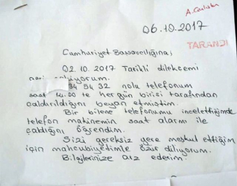 Vatandaşın, Başsavcılığa yazdığı dilekçede şu ifadelere yer verildi: Cumhuriyet Başsavcılığı'na; 02.10. 2017 tarihli dilekçemi geri çekiyorum. ...34 54 32 nolu telefonum saat 14.00'te her gün birisi tarafından çaldırıldığını beyan etmiştim. Bir bilene telefonumu incelettiğimde telefon makinemin saat alarmı ile çaldığını öğrendim. Sizi gereksiz yere meşgul ettiğim için özür diliyorum. Bilgilerinize arz ederim."