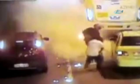 Devrilen motosikletin kıvılcımları sürücüyü yaktı. Alevler içinde kalan motosikletli böyle söndürüldü. İnanılmaz kaza Brezilya'da gerçekleşti. Trafikte ilerleyen motosikletli bir anda aracının direksiyon hakimiyetini kaybedince yere düşüp sürüklenmeye başladı. Sürüklenmenin etkisiyle alev alan motosikletten sıçrayan kıvılcımlar, sürücüyü tutuşturdu. Can havliyle koşan şahsın yardımına bir otobüs şoförü yetişti. Yangın söndürme tüpüyle söndürülen yaralı sürücü hastaneye kaldırılırken, canını hiçe sayan otobüs şoförü bu kez ateş topuna dönen motosiklete müdahale etti. Neyse ki şoföre bir şey olmazken, o anlar kameraya yansıdı.