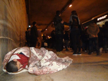 İstanbul'da geçtiğimiz günlerde mendil satan çocuğun metrobüste yorgunluğa dayanamayıp bir yolcunun dizine başını koyarak uyuyakalması yürekleri sızlatmıştı. Benzer bir görüntü bu kez Taksim'de kaydedildi. Cumhuriyet altgeçidinde otobüs duraklarında kameraya yansıyan görüntüde yine ufak bir çocuk vardı.
