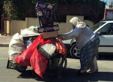 Pet şişe ve kartonları toplayarak yaşam mücadelesi veren ismi öğrenilemeyen yaşlı kadın, Seyhan ilçesi Kurtuluş Mahallesi'nde kurulan semt pazarına geldi. Pazarda atık olarak bulunan karton ve pet şişeleri toplayıp çuvallara koyan daha sonra o çuvalları da tekerlekli sandalyeye yerleştiren 70-75 yaşlarındaki kadın, trafikte sandalyeyi sürerek yoluna devam etti.