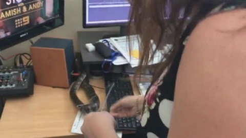 Avustralya'da bir televizyon kanalına ofisinde çalışan kadın, masasındaki 2 metrelik yılanı soğukkanlılıkla yakalayarak torbaya koydu.