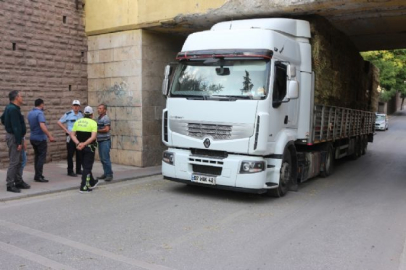 Konya'da alt geçide sıkışan saman yüklü tır, yaklaşık 2 saat sonra çekici yardımıyla kurtarıldı.