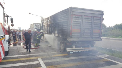 Düzce D-100 Karayolunda seyir halindeki tırın lastikleri alev alev yandı. Yangın nedeniyle D-100 üzerindeki trafik bir süre duraksadı.