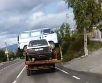 İzmir'in Foça ilçesinde, bir kamyonete bir minibüs ve otomobilin yüklendiği görüntüler bu kadarına da pes dedirtti. Yeni Foça'da bir vatandaşın trafikte kaydettiği görüntüler trafiğin nasıl tehlikeye sokulduğunu gözler önüne serdi. Görüntülerde, bir kamyonete yanlamasına minibüs, diklemesine ise otomobil konularak götürüldüğü görüldü. Normal şartlarda tek aracın yüklenebileceği kamyonete biri minibüs iki aracın yüklenerek götürülmesi trafiği tehlikeye soktu. Bu anlar ise kamyonetin arkasında seyreden bir motosikletli tarafından cep telefonuyla kaydedildi.