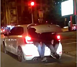 Kayseri'de, otomobilin bagajında oturarak seyahat eden iki genci gören vatandaşlar şaşkınlıklarını gizleyemedi.
