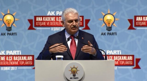 "İLÇE BAŞKANLARININ MADDELERİ EZBERE BİLMESİNİ İSTİYORUM" Anayasa değişikliği maddelerini ilçe başkanlarının ezbere bilmesi gerektiğine dikkati çeken Yıldırım, "İlçe başkanlarının öncelikle bu maddeleri ezbere bilmesini istiyorum. Kafanıza adınız gibi nakşedeceksiniz. Kendimiz bilmeden milletimize anlatamayız, milletimizin kafasındaki soruları cevaplayamayız. Partimizin hazırlıkları mevcut, bu notları, dökümanları bütün ayrıntıları ile okuyun, değerlendirin, kafanıza takılanları sormayı ihmal etmeyin" diye konuştu. Muhalefetin yeni sistemle getirilen değişikliği yalan kampanyası yaklaşımıyla her mecrada anlattığını belirten Yıldırım, "Adeta yalan rüzgarı. Yalanın bini bin para. Yüz kızarmıyorsa dilin zaten kemiği yok, üfürüyor da üflüyorlar. Rahmetli babamın bir lafını hatırlıyorum, genişten alan insanları gördüğü zaman şöyle derdi, 'Kaval elin yel Allah'ın üfle evladım üfle'. Şimdi bunlar da, kaval elin yel Allah'ın, üfleyin bakalım. Tek adamlıktan girip ülkenin bölünmesine kadar işi vardırıyorlar. Bizim bu yalanlar karşısındaki en büyük gücümüz doğruları anlatmaktır. Milletimizle kucaklaşmaktır. Millete doğrudan, her zaman doğruları anlatacağız. Cumhurbaşkanlığı hükümet sisteminin ne olduğunu, ülkemize ne kazandıracağını, milletimize ne gibi katkılarının olacağını teker teker sabırla anlatacağız" şeklinde konuştu. Ana muhalefet partisini anayasa değişikliği konusunda aldığı tavır dolayısıyla eleştiren Yıldırım, "O gün tilki fıstığı çıkarmasaydı, 367 icadını yapmasaydı belki bunlara ihtiyacı kalmazdı. Hem ülkeyi kaosa krize sürükleyeceksiniz, ondan sonra bölünme diktatörlük teranelerini okuyacaksınız. Bu millet yemez" dedi. Başbakan Yıldırım, konuşmasını şöyle sürdürdü: "Kim hükümet olacak, kim Cumhurbaşkanı olacak ben karar vereceğim. Ben yetkiyi verdikten sonra bilmediğim tanımadığım adamlar devreye girip, benim adıma iş çevirmeyecek. Yapılan budur. CHP, hiç milletin teveccühüne ram olarak iktidar yönünde gayret göstermediği için buna karşı çıkmasını anlayabiliriz. CHP krizlerden, kaoslardan, vesayetlerden medet umarak, yarım yamalak iktidarın köşesinden kendine yer bulmuştur. Bu sistemde artık buna yer yok. Çalışan, gayret eden, milleti ikna eden herkes tek başına iktidar oluyor. İstikrar ve güven. İki sihirli kelime" ifadelerini kullandı.