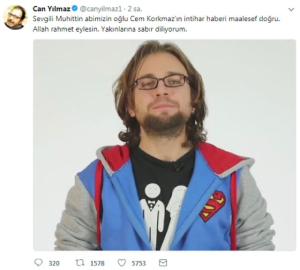 İddiaya göre, Üsküdar'da evinde ölü bulunan 30 yaşındaki Cem Korkmaz'ın intihar ettiği haberi, Cem Yılmaz'ın ağabeyi Can Yılmaz Twitter hesabında doğruladı. "G.O.R.A" filminden de hatırlanan Muhittin Korkmaz'ın oğlu olan Cem Korkmaz, "Recep İvedik 4" filminde rol almıştı.