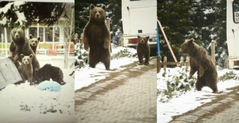Baharın ilk günleriyle birlikte Uludağ'daki ayılar da kış uykusundan uyanmaya başladı. Mağaralardan çıkan sevimli ayı ve 3 yavrusu, karların kısmen eridiği Sarıalan'daki yerleşim bölgesine kadar geldi. Buradaki çöpleri karıştırıp yiyecek arayan ayı ve 3 yavrusu poz vermeyi ihmal etmedi.