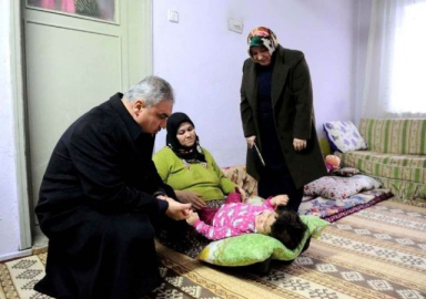 Uşak Valisi Ahmet Okur ve eşi amansız hastalığa yakalanan 3 yaşındaki Medine Su'yu evinde ziyaret etti.