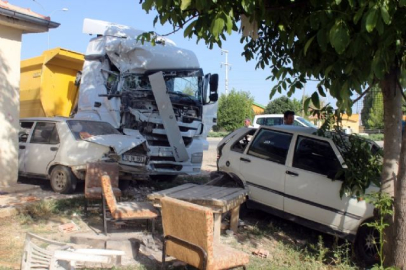 Karaman'da kontrolden çıkan bir hafriyat kamyonu park halindeki iki otomobile çarptıktan sonra eve daldı.
