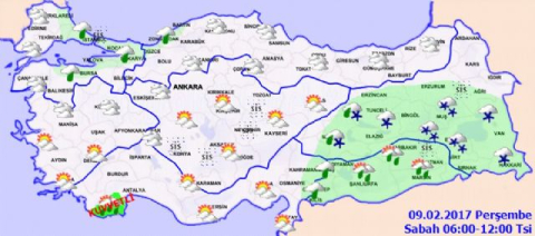 Ülke genelinin parçalı ve çok bulutlu, Marmara'nın kuzey ve doğusu, Güney Ege, Göller Yöresi, Batı Karadeniz , Doğu Anadolu'nun güney ve batısı, Güneydoğu Anadolu ile Kahramanmaraş, Erzurum, Ağrı çevreleri ile Çanakkale'nin doğu ilçeleri ve Antalya'nın batı ilçelerinin yağışlı geçeceği tahmin ediliyor. Yağışların; hafif yağmur ve sağanak, Doğu Anadolu'da karla karışık yağmur ve kar, bu sabah saatlerinde Antalya'nın Kumluca, Demre ve Finike ilçelerinde kuvvetli sağanak ve gök gürültülü sağanak şeklinde olması bekleniyor. Sabah ve gece saatlerinde iç ve doğu bölgelerimizde yer yer sis ve pus hadisesi ile birlikte, doğu kesimlerde buzlanma ve don olayı görüleceği tahmin ediliyor.