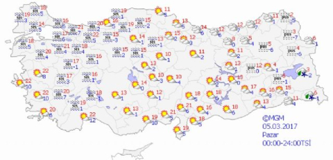 Yapılan son değerlendirmelere göre, yurtta bugün hava durumu şöyle. Ülkenin doğu kesimleri ile zamanla Marmara'nın batısının parçalı yer yer çok bulutlu, sabah saatlerinde Rize çevreleri ile Artvin'in kıyı kesiminin hafif yağmurlu, öğle saatlerinde Hakkari ve Van çevrelerinin hafif olmak üzere karla karışık yağmur ve kar yağışlı, diğer yerlerin az bulutlu ve açık geçeceği tahmin ediliyor. Sabah ve gece saatlerinde İç Anadolu, Karadeniz'in iç kesimleri ile Doğu Anadolu'da buzlanma ve don olayı, Marmara'nın güney ve doğusu ile iç ve doğu kesimlerde yer yer sis ve pus hadisesi bekleniyor. Meteoroloji Genel Müdürlüğünden alınan tahminlere göre, hava sıcaklığı kuzey ve iç kesimlerde 4 ila 6 derece artacak, diğer yerlerde önemli bir değişiklik olmayacak. Rüzgar, genellikle kuzey ve kuzeydoğu, zamanla Trakya'da güney ve batı yönlerden hafif, ara sıra orta kuvvette esecek. Bazı illerde beklenen hava durumuyla günün en yüksek sıcaklıkları ise şöyle: Ankara: Az bulutlu ve açık 15 İstanbul: Az bulutlu 16 İzmir: Az bulutlu ve açık 22 Adana: Az bulutlu ve açık 21 Antalya: Az bulutlu ve açık 22 Samsun: Parçalı bulutlu 13 Trabzon: Parçalı bulutlu 12 Erzurum: Parçalı ve çok bulutlu 5 Diyarbakır: Parçalı bulutlu 17
