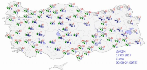 Yurdun genelinin parçalı ve çok bulutlu, Güney Ege kıyıları dışında tüm yurtta havanın yağışlı olacağı tahmin ediliyor. Yağışların Marmara, Kuzey Ege Kıyıları, Akdeniz, Karadeniz kıyıları ile Güneydoğu Anadolu bölgesinde yağmur ve sağanak, yağış alan diğer yerlerde karla karışık yağmur ve kar şeklinde olmak üzere gece saatlerinden sonra Hakkari, Bingöl ve Bitlis çevrelerinde yoğun kar şeklinde olması bekleniyor. Bu sabah ve gece saatlerinde iç ve doğu kesimlerde buzlanma ve don olayı görüleceği tahmin ediliyor.