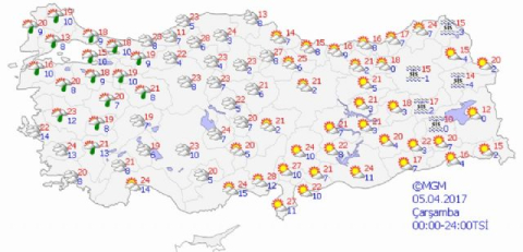 Marmara, Ege Bölgesinin kuzey ve iç kesimleri ile Düzce, Zonguldak, Bolu, Eskişehir ve Ankara çevrelerinin hafif olmak üzere aralıklı yağmur ve sağanak yağışlı, diğer yerlerin parçalı ve az bulutlu geçeceği tahmin ediliyor. Sabah ve gece saatlerinde Marmara'nın güney ve doğusu, İç Ege, İç Anadolu'nun kuzeyi, Batı Karadeniz ile Orta ve Doğu Karadeniz kıyılarında yer yer sis ve pus hadisesi bekleniyor.