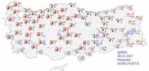 Artvin ve Ardahan dışında ülkenin tamamının yağışlı, Artvin ve Ardahan çevrelerinin ise parçalı, zamanla çok bulutlu geçeceği tahmin ediliyor. Yağışların genellikle yağmur ve sağanak, öğle saatlerinden sonra Marmara'nın güney ve batısı, Ege, Akdeniz, Batı Karadeniz'in iç kesimleri, İç Anadolu'nun güney ve batısı ile Kırıkkale ve Yozgat çevrelerinde gök gürültülü sağanak şeklinde olması bekleniyor.