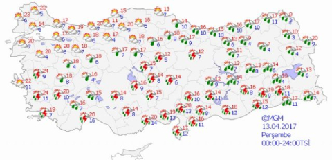 Ülke genelinin parçalı, yer yer çok bulutlu, Güney Ege, Akdeniz, İç Anadolu, Orta ve Doğu Karadeniz, Doğu ve Güneydoğu Anadolu ile Afyonkarahisar, Uşak ve Sinop çevrelerinin yağmur ve sağanak, yer yer gök gürültülü yağışlı geçeceği tahmin ediliyor. Yağışların Doğu Akdeniz, Güneydoğu Anadolu, Doğu Anadolu'nun güney ve batısı ile Antalya, Karaman ve Konya'nın güney çevrelerinde kuvvetli, yer yer çok kuvvetli (21-75 mm) olması bekleniyor.