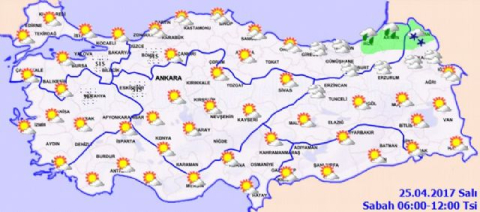 Yapılan son değerlendirmelere göre, yurtta bugün hava durumu şöyle. Ülkemizin kuzeydoğu kesimleri ile güneybatı kesimleri parçalı ve çok bulutlu, Rize, Artvin ve Ardahan çevrelerinin yağışlı, diğer yerlerin az bulutlu ve açık geçmesi bekleniyor. Yağışların, genellikle yağmur ve sağanak, iç kesimlerin yüksekleri ile Ardahan çevrelerinde karla karışık yağmur ve yer yer kar yağışı şeklinde olacağı tahmin ediliyor. Meteoroloji Genel Müdürlüğünden alınan tahminlere göre, hava sıcaklığının iç ve batı kesimlerde artacağı, kuzeydoğu kesimlerde azalacağı tahmin ediliyor. Rüzgarın, genellikle kuzey, Doğu Anadolu'nun güneydoğusu ile Güneydoğu Anadolu'nun doğusunda güney yönlerden hafif, ara sıra orta kuvvette esmesi bekleniyor. Bazı illerde beklenen hava durumuyla günün en yüksek sıcaklıkları ise şöyle: Ankara:Az bulutlu 15 İstanbul:Az bulutlu 17 İzmir: Az bulutlu zamanla parçalı bulutlu 22 Adana:Az bulutlu 26 Antalya:Az bulutlu zamanla parçalı bulutlu 23 Samsun:Parçalı ve az bulutlu 13 Trabzon:Parçalı ve az bulutlu 12 Erzurum:Az bulutlu 9 Diyarbakır:Parçalı bulutlu 19