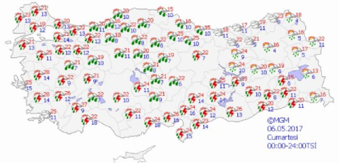 Ülkenin geneli parçalı ve çok bulutlu, Doğu Karadeniz kıyıları, İzmir, Muğla ve Gümüşhane dışında tüm yurdun yerel olmak üzere sağanak ve yer yer gök gürültülü sağanak yağışlı geçeceği tahmin ediliyor. Yağışların; Marmara'nın güneydoğusu, Batı ve Orta Karadeniz, Göller Yöresi, Doğu Akdeniz'in iç kesimleri, İç Anadolu'nun kuzeybatısı ile Kütahya, Çankırı, Kırıkkale, Kırşehir, Konya, Tunceli, Diyarbakır'ın kuzey ve Balıkesir'in doğu çevrelerinde yerel olarak kuvvetli olması bekleniyor. Karadeniz kıyıları ile Marmara'nın doğusunda yer yer pus ve sis olayı bekleniyor.