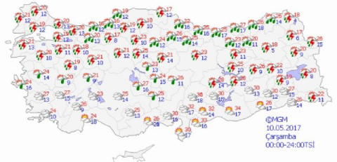 Yurt genelinin parçalı ve çok bulutlu, Marmara, Kuzey Ege, İç Anadolu'nun kuzeyi, Karadeniz, Doğu Anadolu ile Niğde, Kayseri ve Nevşehir çevrelerinin sağanak ve yer yer gök gürültülü sağanak yağışlı geçeceği tahmin ediliyor. Yağışların Orta ve Doğu Karadeniz ile Bartın çevrelerinde yerel olarak kuvvetli olması bekleniyor. Meteoroloji Genel Müdürlüğünden alınan tahminlere göre, hava sıcaklığının kuzeybatı kesimlerde 2 ila 5 derece azalacağı, iç ve doğu bölgelerde 2 ila 4 derece artacağı tahmin ediliyor. Rüzgar, genellikle güney ve güneybatı, Batı Karadeniz, İç Anadolu'nun batısı ile Kuzey Ege'de kuzey ve kuzeybatı yönlerden hafif, ara sıra orta kuvvette, Doğu Akdeniz'in iç kesimleri, İç Anadolu'nun güney ve doğusu, Orta ve Doğu Karadeniz'in iç kesimleri ile Doğu Anadolu'da kuvvetli ve yer yer kısa süreli fırtına (50-80 yer yer 100 Km/sa) şeklinde esmesi bekleniyor. Bazı illerde beklenen hava durumuyla günün en yüksek sıcaklıkları ise şöyle:
