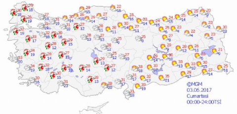 Yapılan son değerlendirmelere göre, yurtta hava durumu şöyle: Yurdun batı kesimlerinin parçalı bulutlu, Marmara'nın güney ve batısı, İç Ege, Batı ve Orta Akdeniz'in iç kesimleri, İç Anadolu'nun güneyi, Eskişehir ve Bolu çevreleri ile Sakarya'nın güney, Adana'nın kuzey ve Ankara'nın batı kesimlerinin sağanak ve gök gürültülü sağanak yağışlı, diğer yerlerin az bulutlu ve açık geçeceği tahmin ediliyor. Yağışların, öğle saatlerinden sonra Edirne ve Kırklareli çevreleri ile Tekirdağ'ın iç kesimlerinde yerel olarak kuvvetli olması bekleniyor. Marmara'nın doğusu ile Batı Karadeniz'in iç kesimlerinde sabah saatlerinde yer yer pus ve sis hadisesi görüleceği tahmin ediliyor. Meteoroloji Genel Müdürlüğünden alınan tahminlere göre, hava sıcaklığının kuzey, iç ve doğu kesimlerde 3 ila 5 derece artacağı tahmin ediliyor. Rüzgarın kuzey ve doğu, yurdun güneybatı kesimlerinde yer yer güneyli yönlerden hafif ara sıra orta kuvvette esmesi bekleniyor. Bazı illerde beklenen hava durumuyla günün en yüksek sıcaklıkları ise şöyle: Ankara: Az bulutlu ve açık, öğle saatlerinden sonra parçalı bulutlu, batı kesimleri kısa süreli ve yerel olmak üzere sağanak ve gökgürültülü sağanak yağışlı 28 İstanbul: Parçalı bulutlu, sabah saatlerinde yer yer pus ve sisli 27 Bursa: Parçalı bulutlu, öğle saatlerinden sonra sağanak ve gök gürültülü sağanak yağışlı 32 İzmir: Parçalı bulutlu, öğle saatlerinden sonra iç kesimleri yerel olmak üzere sağanak ve gök gürültülü sağanak yağışlı 33 Adana: Parçalı bulutlu, öğle saatlerinden sonra kuzey çevreleri yerel olmak üzere sağanak ve gök gürültülü sağanak yağışlı 31 Antalya: Parçalı bulutlu, öğle saatlerinden sonra iç kesimleri yerel olmak üzere sağanak ve gök gürültülü sağanak yağışlı 31 Samsun: Parçalı ve az bulutlu 23 Trabzon: Parçalı ve az bulutlu 24 Erzurum: Az bulutlu, öğle saatlerinde parçalı bulutlu 22 Diyarbakır: Az bulutlu ve açık 33