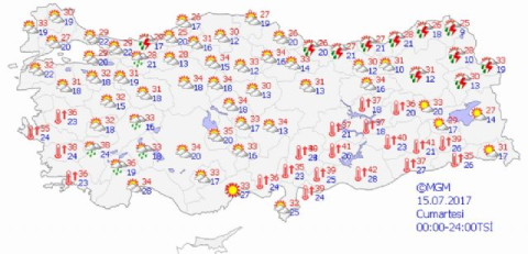 Yapılan son değerlendirmelere göre, yurtta hava durumu bugün şöyle. Yurdun kuzey, iç ve doğu kesimlerinin parçalı ve yer yer çok bulutlu, Çanakkale, İstanbul, Kocaeli ve Sakarya ile zamanla Batı Karadeniz'in iç kesimleri, Doğu Karadeniz kıyıları, Doğu Anadolu'nun kuzeydoğusu, Bilecik, Düzce, Afyon, Denizli, Isparta, Burdur, Eskişehir, Ankara, Çankırı, Ordu ve Artvin çevrelerinin kısa süreli ve yerel olmak üzere sağanak ve yer yer gök gürültülü sağanak yağışlı, diğer yerlerin az bulutlu ve açık geçeceği tahmin ediliyor. Meteoroloji Genel Müdürlüğünden alınan tahminlere göre, hava sıcaklığında önemli bir değişiklik beklenmiyor. Sıcaklığın ülke genelinde mevsim normallerinin üzerinde seyredeceği tahmin ediliyor. Rüzgarın genellikle kuzey ve kuzeydoğu, Akdeniz kıyıları ile güneydoğu kesimlerde güney ve güneybatı yönlerden hafif, ara sıra orta kuvvette, Marmara ile Kuzey Ege kıyılarında kuvvetli (30-50 km/sa) olarak eseceği tahmin ediliyor. Bazı illerde beklenen hava durumuyla günün en yüksek sıcaklıkları ise şöyle: Ankara: Parçalı ve çok bulutlu, öğle saatlerinden sonra kısa süreli ve yerel olmak üzere sağanak ve gök gürültülü sağanak yağışlı 34 İstanbul: Parçalı ve çok bulutlu, öğle saatlerinden itibaren kısa süreli ve yerel olmak üzere sağanak ve gök gürültülü sağanak yağışlı 29 Bursa: Parçalı ve az bulutlu 32 İzmir: Az bulutlu ve açık 35 Adana: Parçalı ve az bulutlu 36 Antalya: Az bulutlu ve açık, zamanla iç kesimleri parçalı bulutlu 34 Samsun: Parçalı ve zamanla çok bulutlu 26 Trabzon: Az bulutlu ve açık, zamanla parçalı ve çok bulutlu, öğle saatlerinden sonra kısa süreli ve yerel olmak üzere sağanak ve gök gürültülü sağanak yağışlı 27 Erzurum: Az bulutlu ve açık, zamanla parçalı ve çok bulutlu, öğle saatlerinden sonra kısa süreli ve yerel olmak üzere sağanak ve gök gürültülü sağanak yağışlı 31 Diyarbakır: Az bulutlu ve açık 40