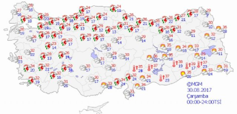 Marmara'nın doğusu, İç Ege, Akdeniz'in iç kesimleri, İç Anadolu'nun kuzeybatısı, Karadeniz ile Tekirdağ, Hatay'ın kuzey kıyı ilçeleri ile Gaziantep'in batı ilçelerinin yerel olmak üzere sağanak ve yer yer gök gürültülü sağanak yağışlı, diğer yerlerin parçalı ve az bulutlu geçeceği tahmin ediliyor. Yağışların; Sinop, Samsun, Ordu, Giresun çevreleri ile Kastamonu'nun kuzey ilçelerinde yer yer kuvvetli olması bekleniyor.