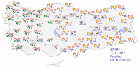 Yapılan son değerlendirmelere göre, yurtta bugün hava durumu şöyle. Marmara, Ege, Batı Akdeniz, İç Anadolu'nun kuzeybatısı, Batı Karadeniz ile Adana, Mersin, Konya, Aksaray, Kırşehir ve Kırıkkale çevrelerinin sağanak ve gök gürültülü sağanak yağışlı geçeceği tahmin ediliyor. Yağışların öğle saatlerinden itibaren Kıyı Ege, Batı Akdeniz kıyıları ile Çanakkale ve Edirne çevreleri, Denizli ve Isparta'nın güney kesimleri, Burdur'un doğu ilçeleri, Balıkesir'in batı ilçelerinde kuvvetli, Muğla çevreleri ve Antalya'nın merkez ve doğu ilçelerinde kuvvetli ve yer yer çok kuvvetli olması bekleniyor. Sabah ve gece saatlerinde iç bölgelerde yer yer sis ve pus hadisesi meydana geleceği tahmin ediliyor. Meteoroloji Genel Müdürlüğünden alınan tahminlere göre, hava sıcaklıklarında önemli bir değişiklik olmayacak. Rüzgarın genellikle güney ve güneybatı yönlerden, Doğu Akdeniz ile Güneydoğu Anadolu'da kuzeydoğudan hafif, ara sıra orta kuvvette, İç ve Güney Ege ile Batı Akdeniz'de kuvvetlice (30-60 Km/sa) eseceği tahmin ediliyor. Bazı illerde beklenen hava durumuyla günün en yüksek sıcaklıkları ise şöyle: Ankara: Parçalı ve çok bulutlu, akşam saatlerinden sonra batısı, gece saatlerinden sonra il geneli yağmur ve sağanak yağışlı 14 İstanbul: Parçalı ve çok bulutlu, akşam saatlerinden sonra sağanak yağışlı 17 İzmir: Parçalı çok bulutlu, sağanak ve gök gürültülü sağanak yağışlı (Yağışların öğle saatlerinden sonra kuvvetli olması bekleniyor.) 16 Bursa: Parçalı ve çok bulutlu, akşam saatlerinden sonra sağanak yağışlı 19 Adana: Parçalı ve çok bulutlu, gece saatlerinden sonra sağanak ve gök gürültülü sağanak yağışlı 20 Antalya: Parçalı yer yer çok bulutlu, sağanak ve gök gürültülü sağanak yağışlı (Yağışların; öğle saatlerinden itibaren batı kesimlerinin kuvvetli, merkez ve doğu ilçelerinde kuvvetli ve yer yer çok kuvvetli olması bekleniyor.) 19 Samsun: Parçalı ve az bulutlu 19 Trabzon: Parçalı ve az bulutlu 17 Erzurum: Parçalı bulutlu 4 Diyarbakır: Parçalı bulutlu 14