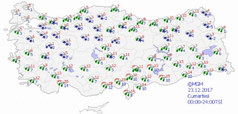 Yurt genelinin parçalı ve çok bulutlu aralıklı yağışlı geçeceği tahmin ediliyor. Yağışların; Batı ve Orta Karadeniz, Sakarya, Bilecik, Kütahya, Osmaniye, Giresun, Tunceli ve Bingöl çevreleri ile Antalya'nın doğu kesimlerinde kuvvetli olmak üzere kıyı kesimler, İç Ege'nin güneyi, Akdeniz, Doğu Anadolu'nun batısı ile Güneydoğu Anadolu'da yağmur ve sağanak, diğer yerlerde karla karışık yağmur ve kar şeklinde olması bekleniyor. Sabah ve gece saatlerinde iç ve doğu kesimlerde yer yer buzlanma ve don olayı görüleceği tahmin ediliyor.