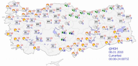 Yapılan son değerlendirmelere göre, yurtta hava durumu bugün şöyle. Yurdun kuzey, iç ve doğu kesimlerinin parçalı ve çok bulutlu, Orta ve Doğu Karadeniz kıyıları, Sinop, Amasya, Tokat ve Artvin ile sabah ilk saatlerde Kayseri, Kırşehir ve Nevşehir çevrelerinin yağmurlu geçeceği tahmin ediliyor. Sabah ve gece saatlerinde iç ve doğu kesimlerde yer yer pus ve sis, Doğu Karadeniz'in iç kesimleri ile Doğu Anadolu'nun doğusunda buzlanma ve don olayı bekleniyor. Meteoroloji Genel Müdürlüğünden alınan tahminlere göre, hava sıcaklığının güney, iç ve batı kesimlerde 2 ila 4 derece artacağı, diğer yerlerde değişmeyeceği tahmin ediliyor. Ülke genelinde mevsim normallerinin 2 ila 6 derece üzerinde seyretmesi bekleniyor. Rüzgarın genellikle kuzey ve kuzeydoğu, batı kesimlerde güney yönlerden hafif, ara sıra orta kuvvette eseceği tahmin ediliyor. Bazı illerde beklenen hava durumuyla günün en yüksek sıcaklıkları ise şöyle: Ankara: Parçalı bulutlu, sabah ve gece saatlerinde yer yer pus ve sisli 9 İstanbul: Az bulutlu, sabah ve gece saatlerinde yer yer pus ve sisli 12 İzmir: Az bulutlu 16 Adana: Parçalı, iç kesimleri yer yer çok bulutlu 17 Antalya: Parçalı ve az bulutlu 19 Samsun: Çok bulutlu, sabah saatlerinde yağmurlu 12 Trabzon: Çok bulutlu, aralıklı yağmurlu 13 Erzurum: Parçalı ve çok bulutlu, sabah ve gece saatlerinde yer yer pus ve sisli 2 Diyarbakır: Parçalı ve az bulutlu 11