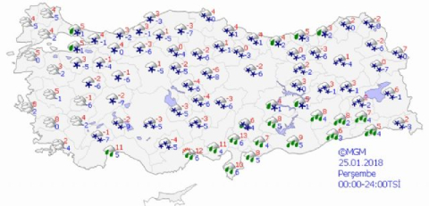 Ülke genelinin çok bulutlu, Marmara'nın doğusu, Akdeniz, İç Anadolu'nun güney ve doğusu, Karadeniz, Doğu ve Güneydoğu Anadolu ile İstanbul, Afyonkarahisar, Kastamonu, Ankara, Çankırı ve Kırıkkale çevrelerinin yağışlı geçeceği tahmin ediliyor. Yağışların Güneydoğu Anadolu'nun doğusu, Elazığ, Şırnak ve Bingöl çevrelerinde kuvvetli yağmur, Konya, Karaman, Niğde, Erzurum, Erzincan, Tunceli, Bitlis ve Muş çevrelerinde yoğun kar şeklinde olmak üzere genellikle karla karışık yağmur ve kar, Akdeniz ile Doğu Karadeniz kıyıları ve Güneydoğu Anadolu Bölgesi'nde yağmur ve sağanak şeklinde olması bekleniyor. Bu sabah ve gece saatlerinde iç ve doğu kesimlerde buzlanma ve don olayı görüleceği tahmin ediliyor.