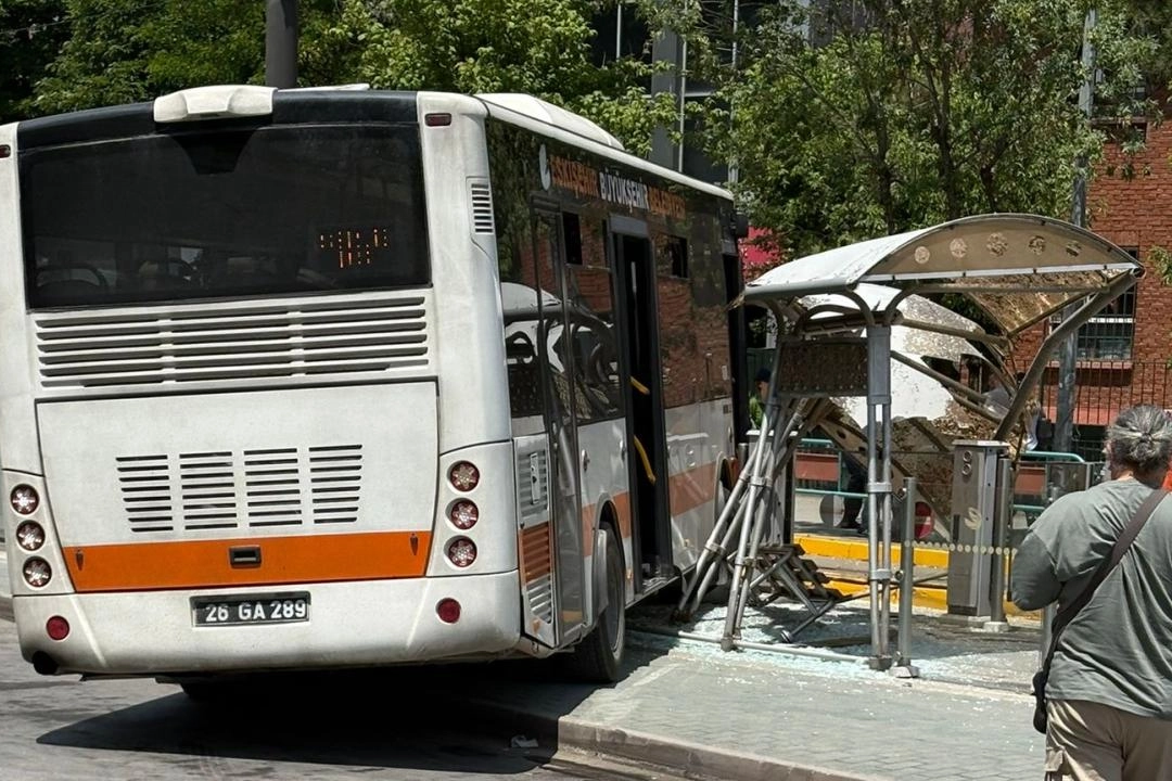 Otobüsün çarpması nedeniyle hasar oluşan tramvay durağı, ekiplerce bulunduğu yerden kaldırıldı.