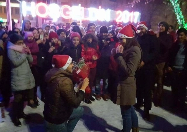Edirne'nin Keşan ilçesinde bir genç, yeni yıla girerken kız arkadaşına evlilik teklifinde bulundu.2016'nın son saniyelerinde Edirne'nin Keşan ilçesinde Cumhuriyet Meydanı'nda toplanan Keşanlılar, kar ve soğuk havaya aldırış etmeden yeni yıl coşkusunu dışarıda kutladı. Cumhuriyet Meydanı'ndaki kutlamalarda en dikkat çeken ise tam 00.00'da kız arkadaşı Cemile Gezgin'e yüzük ve çiçekle evlilik teklifinde bulunan Mustafa Serin oldu. Yeni yılı kutlamak üzere Cumhuriyet Meydanı'na erkek arkadaşı Mustafa Serin ile birlikte gelen Cemile Gezgin, her şeyden habersiz geri sayıma başlarken, erkek arkadaşı Mustafa Serin'in bir anda önünde diz çökmesiyle şaşkına uğradı.Elinde yüzük ile birlikte kız arkadaşının önünde diz çöken Serin, "Benimle bir ömür mutluluğa var mısın? Benimle evlenir misin" diye sordu. Erkek arkadaşının bu sorusu karşılığında neye uğradığını şaşıran Cemile Gezgin, uzun süre bu sürprizin şokunu atlatamadı. Daha sonra ise kız arkadaşından "Evet" cevabını alan Mustafa Serin, kız arkadaşına sarılarak evlilik teklifinin kabulünü kutladı.Mustafa Serin, "Yeni yıla böyle bir sürprizle girmek istedik. Yeni yıl inşallah bize mutluluk, sevgi ve huzur getirir. Ben sevdiğimi buldum. Allah inşallah herkese sevdiğini buldurur. Ben evet cevabını aldım ama kız arkadaşım hala şaşkın. İnşallah bir ömür boyu mutlu oluruz" dedi.Erkek arkadaşının böyle bir teklifte bulunacağını beklemediğini söyleyen Cemile Gezgin ise, "Asla beklemiyordum. Şuan çok şaşkınım. Bir şey diyemiyorum. İnanamıyorum" dedi.Genç çift daha sonra meydandaki vatandaşların tebriklerini kabul ederken, yapılan havai fişek gösterisini izledi.