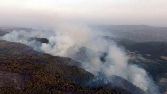 Sakarya'da dün öğlen saatlerinde başlayan orman yangını itfaiye ekiplerince kontrol altına alındı. Yangında 25 hektar alanın etkilendiği öğrenilirken, yanan bölge havadan görüntülendi.Edinilen bilgilere göre, dün öğlen saatlerinde Geyve ilçesi Alıplı ile Çine mahallesi arasında orman yangını çıktı. Rüzgarın etkisiyle orman yangını büyüdü. Bütün ormanı saran yangına Sakarya Büyükşehir Belediyesi, İzmit Büyükşehir Belediyesi, Sakarya Orman Bölge Müdürlüğü ekipleri ve İstanbul Büyükşehir Belediyesine ait yangın helikopteri dahil 40'a yakın araç müdahale etti. Dünden beri yapılan müdahale sonrasında yangının ekiplerce kontrol altına alındığı ve soğutma işlemlerinin devam ettiği öğrenildi. Yanan bölge İHA ekipleri tarafından havadan görüntülendi. Havadan çekilen görüntülerde yangının büyüklüğü gözler önüne seriliyor. (Mustafa Özdemir-Uğur Konuk/İHA)
