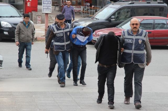 Kahramanmaraş'ta iş yerlerini hedef alan silahlı hırsızlık şebekesinin üyeleri, son işlerinde yakayı ele verdi. Kahramanmaraş Asayiş Şube Müdürlüğü Hırsızlık Büro Amirliği ekiplerince il merkezinde meydana gelen iş yerlerinden hırsızlık yapan şebeke üyelerini yakalamak için operasyon yaptı. Hırsızlık olaylarına ait kamera görüntülerini inceleyen polis, yüzleri kapalı 5 kişinin plakası kapatılmış lüks bir araçla hırsızlık yaptıklarını tespit etti. Ellerinde demir aparatlar ile iş yeri vitrinlerini kırıp saniyelerle iş yerlerini soyan şebeke son işinde yakalandı. Hırsızlık anında otomobilde silahlı gözcü bırakan şebeke üyelerini yakalamak için MOBESE ve PTS kayıtlarından yola çıkan polis, çevre yollarda inceleme başlattı.ŞEBEKE ÜYELERİ HER HIRSIZLIKTA FARKLI OTOMOBİL KULLANMIŞYaşanan hırsızlık olaylarında farklı araç kullandığı tespit edilen şebeke üyelerini polis, Gaziantep yolu üzerinde 06 H 9831 plakalı otomobilde tespit etti. Lüks otomobili takibe alan polis, uzun namlulu silahlarla otomobile operasyon düzenledi. Otomobil içerisinde Mehmet S. (27), Onur Emre A. (20) ve Ö.K. (27) yakalanarak etkisiz hale getirildi. Otomobilde hırsızlıkta kullanılan 3 çift eldiven, kaşkol, 2 adet demir apart, pense ve pompalı tüfek ele geçirildi.ŞEBEKE ÜYELERİNİN YARISI GAZİANTEP'TE YAKALANDIOperasyonu genişleten ekipler, şebekenin diğer üyeleri yakalamak için aynı gece Gaziantep'te operasyonlar yaptı. Gaziantep'te Mehmet B. (20), Adnan Ö. (40) ve Mesut D. (35) gözaltına alındı. Yakalanan şüphelilerden 5'i alınan ifadelerinin ardından adliyeye sevk edildi.Çok sayıda hırsızlık olayından sabıkası olan şüphelilerden 1 adet çalıntı oto, çalıntı 2 adet tablet, 5 adet cep telefonu, 4 bin TL değerinde sigara, sigara rafları, muhtelif giyim ve tüketim malzemesi ele geçirildi.Şüpheliler alınan ilk ifadesinde Kahramanmaraş'ta, 12 ayrı iş yerinden hırsızlık yaptıklarını ve 1 adet otomobil çaldıklarını itiraf etti.(Muhammet Özer - Çağrı Solak / İHA)