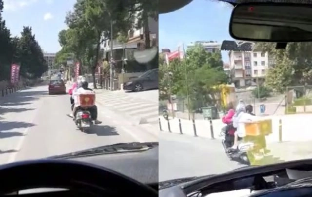 İstanbul Maltepe'de, trafik kurallarını hiçe sayarak 2 çocuklarıyla birlikte motosiklette ilerleyen çift görenleri hayrete düşürdü. Kasksız bir şekilde kendilerinin ve çocuklarının hayatlarını hiçe sayan çiftin tehlikeli yolculuğu kameralara yansıdı. Edinilen bilgiye göre, İstanbul Maltepe'de trafikte hayatlarını hiçe sayarak motosikletin üzerinde çocuklarıyla birlikte yolculuk eden çiftin tehlikeli yolculuğu yürekleri ağza getirdi. Seyir halindeki bir otomobil sürücüsü, 2'si çocuk 4 kişinin karayolunda motosikletle tehlikeli bir şekilde ilerlediğini görünce cep telefonu kamerasıyla kaydetti. Cep telefonuna kaydedilen görüntülerde, motosiklet üzerinde 2 yetişkin ile 2 çocuğun olduğu görülüyor. Görüntülerde çocuklardan birinin sürücünün önünde durduğu görülüyor. Diğer çocuğun ise sürücünün arkasında duran yetişkine sarıldığı görülüyor. Herhangi bir önlem almadan trafikte ilerleyen çiftin kendilerinin ve çocuklarının hayatını tehlikeye attığı yolculuk görenleri hayrete düşürdü.