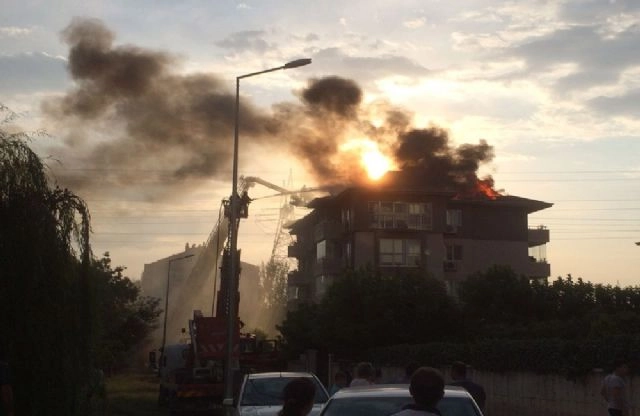 Bursa'da 5 katlı binanın çatısı alev alev yandı.