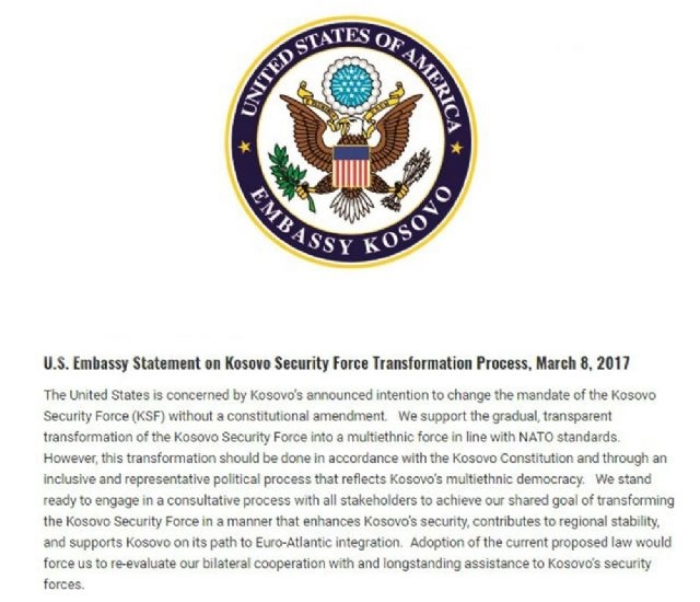 ABD'nin Kosova Büyükelçiliği, Priştine yönetiminin Kosova Güvenlik Gücü'nü (FSK) orduya dönüştürme kararının 'endişe verici' olduğunu savundu.