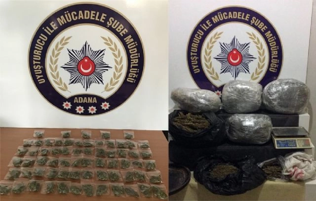 Adana'da sokak satıcılarına yönelik düzenlenen uyuşturucu operasyonunda 60 kilo 600 gram esrar ele geçirilirken olayla ilgili 19 kişi tutuklandı. Adana Emniyet Müdürlüğüne bağlı Uyuşturucuyla Mücadele Şube Müdürlüğü ekipleri Yüreğir ve Seyhan ilçelerinde Hürriyet, Çamlıbel, Denizli, Gürselpaşa, Gülbahçesi, Yenibey, Şakirpaşa, Güzevler ve Köprügöz Mahallelerinde "torbacı" diye tabir edilen sokak satıcılarının uyuşturucu sattığı ihbarını alarak operasyon düzenledi. Güzelevler Mahallesi'nde bir evde hassas burunlu narkotik köpeği Coco ile yapılan aramada Cemal A.'nın evinde 26 kilo esrar ele geçirildi. Polis diğer mahallelerde yaptığı aramada 25 şahsı gözaltına alırken 34 kilo 600 gram esrar, 263 uyuşturucu hap, 140 kök hint keneviri 5 bin 225 lira ve 2 ruhsatsız tabanca ele geçirdi. Operasyonlarda toplam 60 kilo 600 gram esrar ele geçirildi.Gözaltına alınan zanlılardan 19'u tutuklanırken, 5'i adli kontrol şartıyla, 1'i ise savcılıktan serbest kaldı.(Fatih Keçe/İHA)