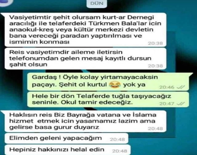 Afrin'de yürütülen Zeytin Dalı Harekatı kapsamında terör örgütü unsurları ile girilen çatışmada şehit olan Piyade Astsubay Üst Çavuş Musa Özalkan'ın vasiyeti herkesi duygulandırdı. Adeta şehit olacağını hisseden kahraman Özalkan'ın arkadaşıyla mesajlaştığı ve devletin ailesine vereceği paranın, müdavimi olduğu bir dernek aracılığıyla Telafer'deki Türkmen çocuklara okul yapımında kullanılmasını ve okula adının konulmasını vasiyet ettiği ortaya çıktı.(Seyid Fatih Poyraz / İHA)